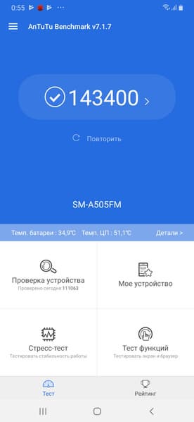 В тесте AnTuTu смартфон набирает более 140 тысяч очков, что очень неплохо. Про плавность интерфейса и быстроту работы приложений можно даже не говорить, все идеально. Платформа легко справляется и с требовательными играми. Это явный жирный плюс для устройства ценой 20 тысяч рублей.
