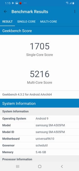 | Samsung Galaxy A50 (Samsung Exynos 9610) | Samsung Galaxy A30 (Samsung Exynos 7904) | Sony Xperia 10 (Qualcomm Snapdragon 630) | Meizu X8 (Qualcomm Snapdragon 710) | Huawei P Smart 2019 (HiSilicon Kirin 710) | |