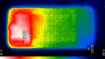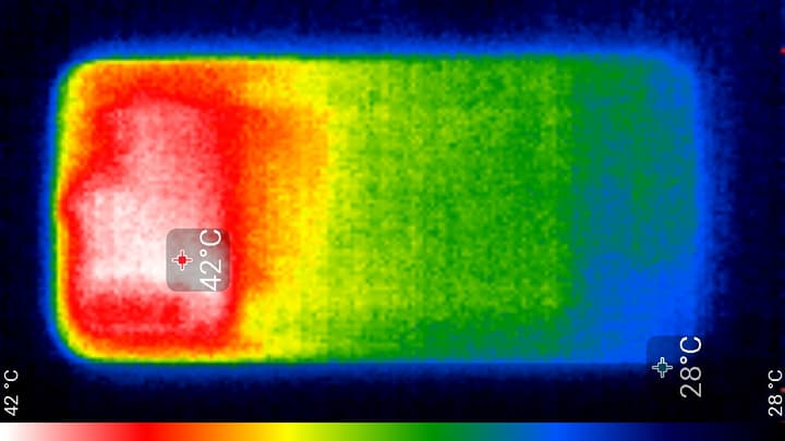Нагрев выше в верхней части аппарата, что, видимо, соответствует расположению микросхемы SoC. По данным теплокамеры, максимальный нагрев составил 42 градуса (при температуре окружающего воздуха в 24 градуса). Такой нагрев нельзя назвать незначительным.