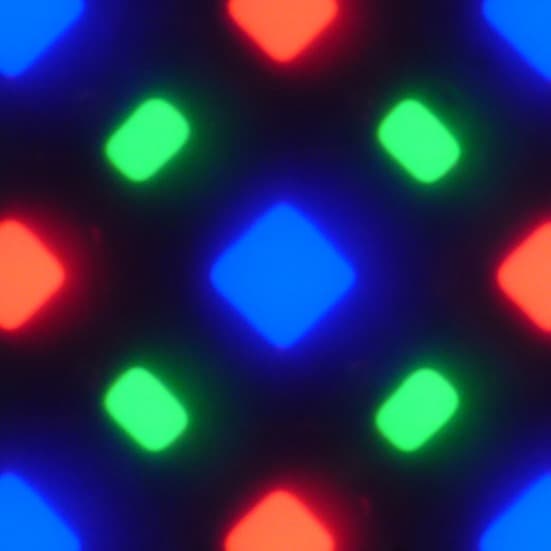 В этом экране используется матрица Super AMOLED — активная матрица на органических светодиодах. Полноцветное изображение создается с помощью субпикселей трех цветов — красного (R), зеленого (G) и синего (B), но красных и синих субпикселей в два раза меньше, что можно обозначить как RGBG. Это подтверждается фрагментом микрофотографии: