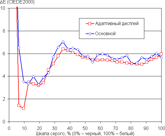 (Самые темные области шкалы серого в большинстве случаев можно не учитывать, так как там баланс цветов не имеет большого значения, да и погрешность измерений цветовых характеристик на низкой яркости большая.)