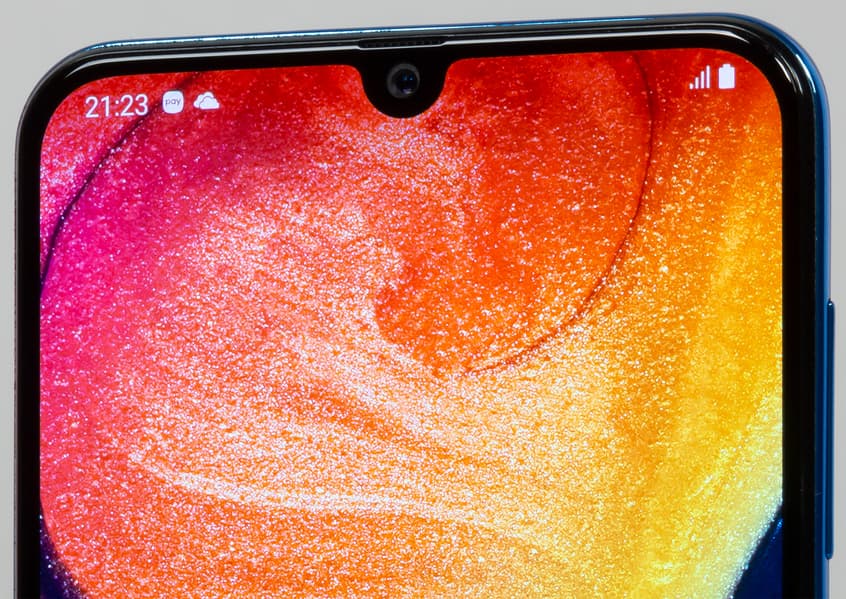 Samsung Galaxy A50 оснащен дисплеем Super AMOLED с защитным 2.5D-стеклом. Размеры экрана составляют 68×147 мм при диагонали 6,4 дюйма, разрешение — 2340×1080 (соотношение сторон 19,5:9), что дает плотность точек около 403 ppi. Ширина рамки с боков составляет 3 мм, отступ снизу — 8 мм, сверху — 3 мм.