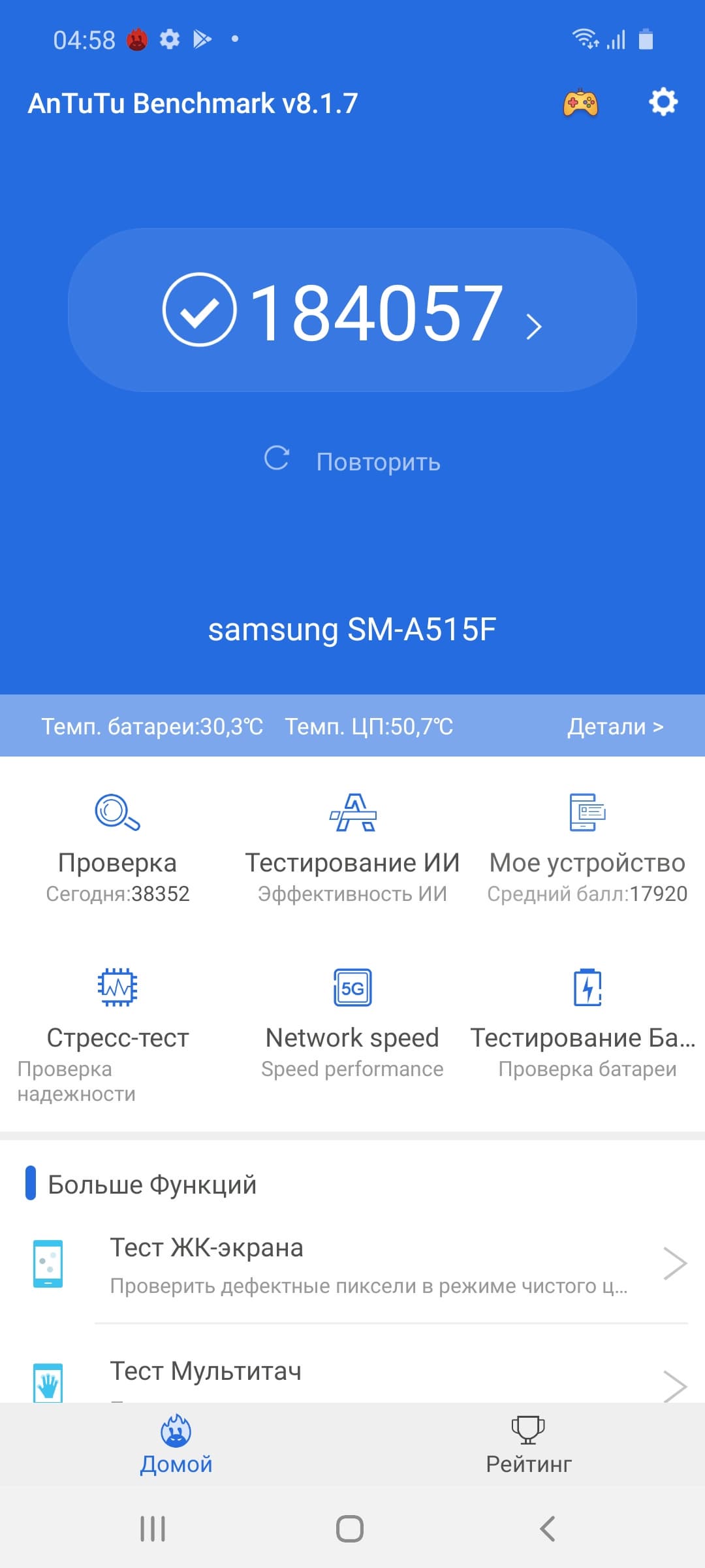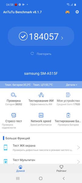 | AnTuTu (v8.x) (больше — лучше) | 184057 | 149351 | 182704 | 156290 | 208142 |