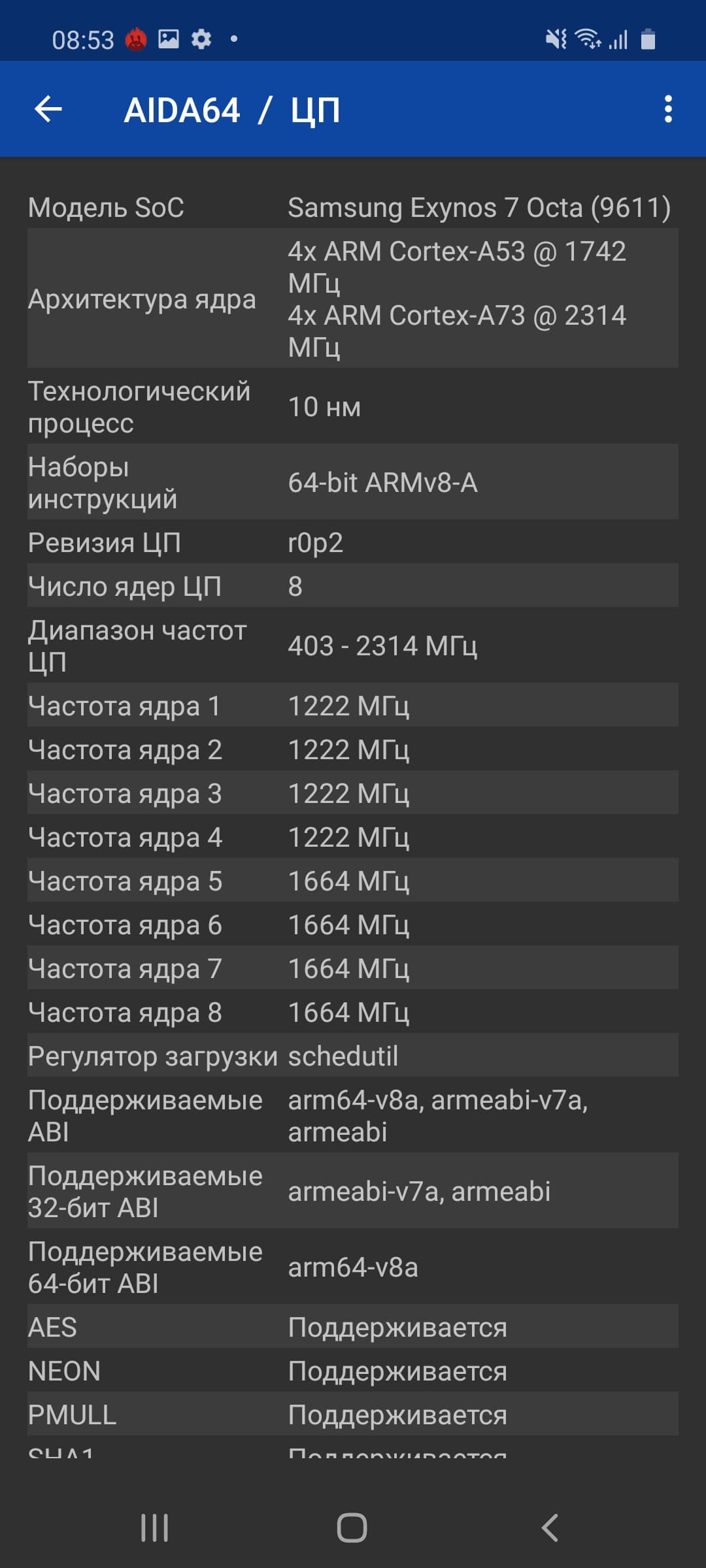 - SoC Samsung Exynos 9611, 8 ядер (4×Cortex-A73 @2,3 ГГц + 4×Cortex-A53 @1,7 ГГц)
