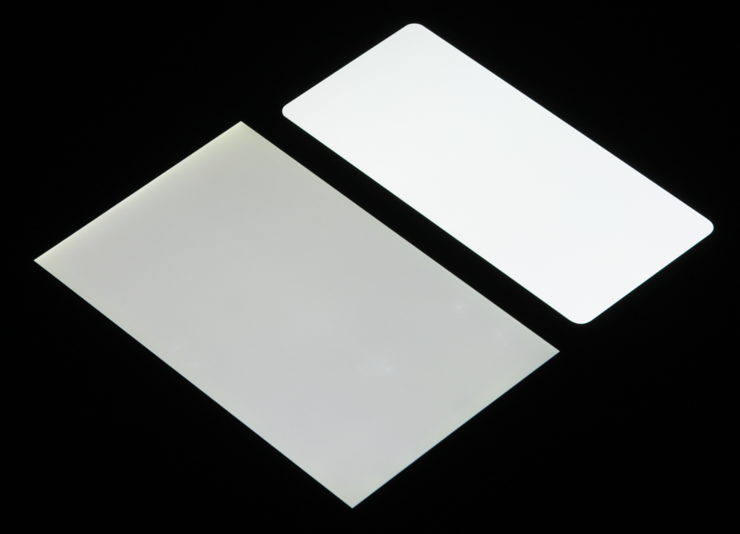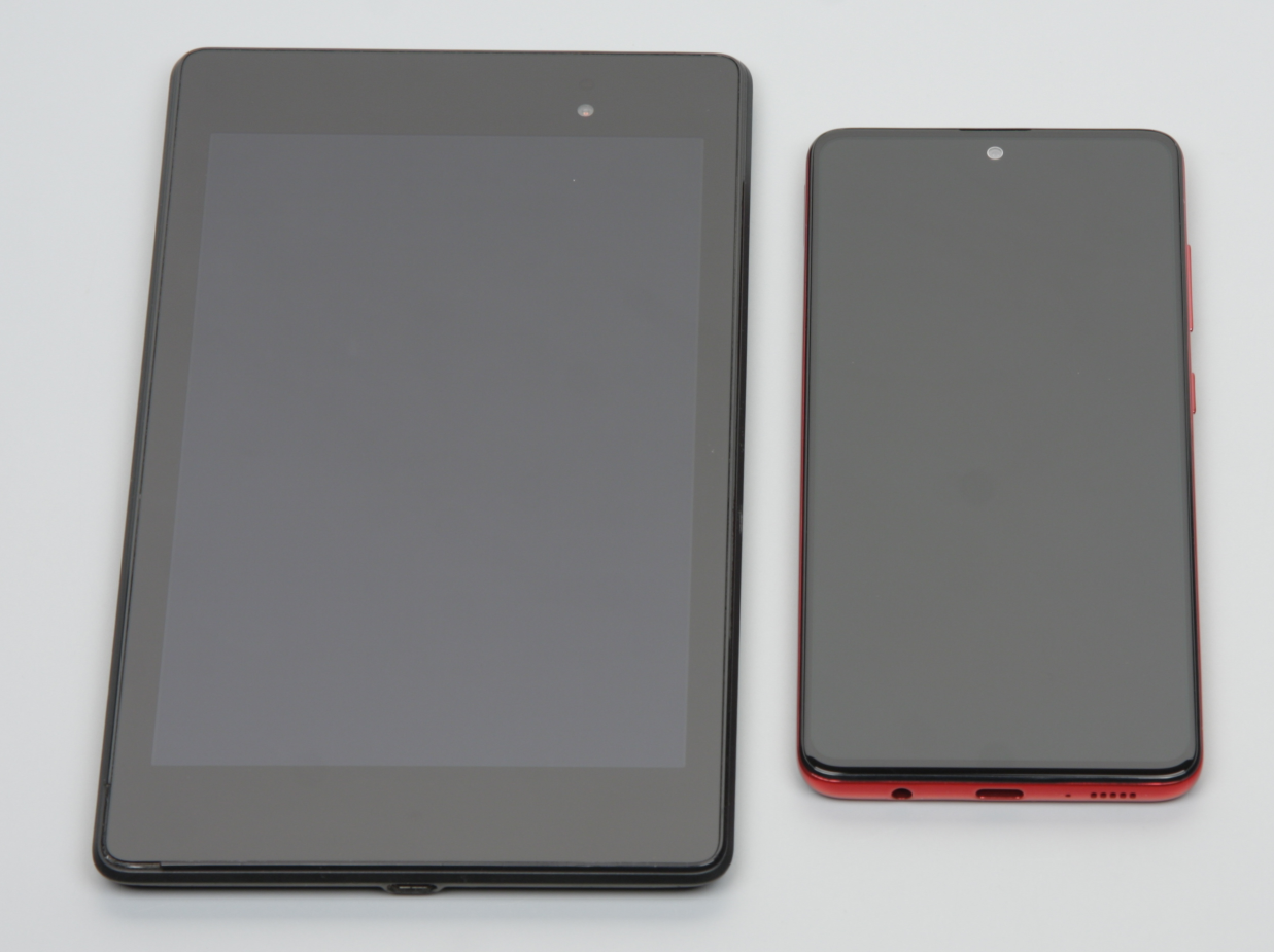 Лицевая поверхность экрана выполнена в виде стеклянной пластины с зеркально-гладкой поверхностью, устойчивой к появлению царапин. Судя по отражению объектов, антибликовые свойства экрана не хуже, чем у экрана Google Nexus 7 (2013) (далее просто Nexus 7). Для наглядности приведем фотографию, на которой в выключенных экранах отражается белая поверхность (слева — Nexus 7, справа — Samsung Galaxy A51, далее их можно различать по размеру):
