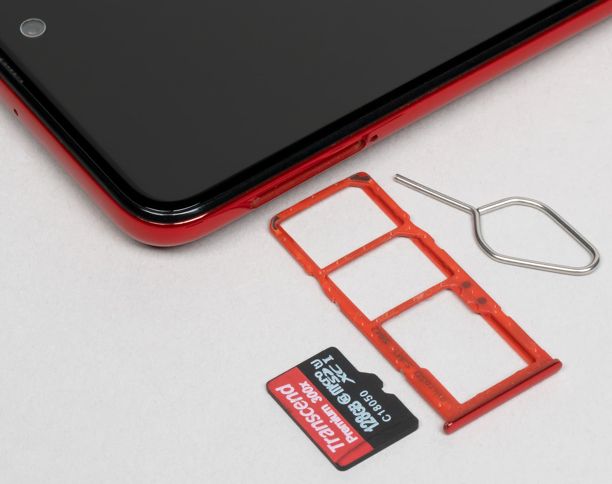 Разъем для карточек рассчитан на две карты Nano-SIM и карту памяти microSD, имея тройной слот. Поддерживается горячая замена.