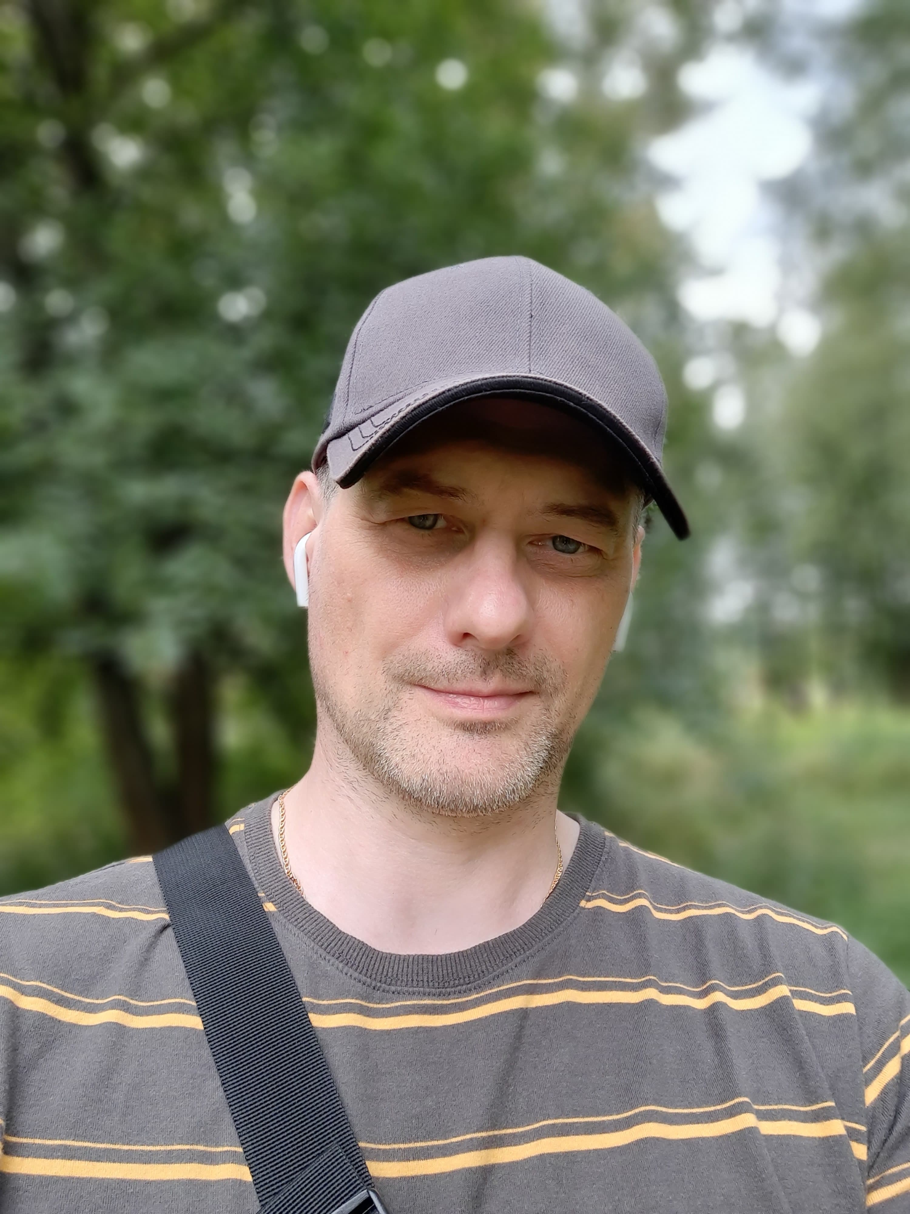 Селфи-камера здесь состоит из одного модуля (32 Мп, f/2.2, ЭФР 26 мм, 1/2.8″, 0.8 мкм), но предоставляет на выбор две картинки: нормальную, которую выдает за групповую, и кропнутую (8 Мп), которую предлагает в качестве основной. Впрочем, и «нормальная» делается по умолчанию в разрешении 12 Мп. В любом случае, съемка на фронтальную камеру удается смартфону не лучше, чем А41. Картинка четкая, но блеклая. Детализация не максимальна и есть недоэкспонированные участки, но для показа на экране самого смартфона и соцсетей — достаточно.