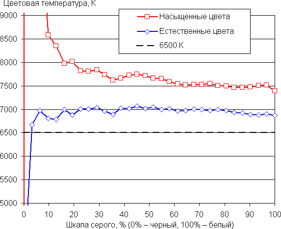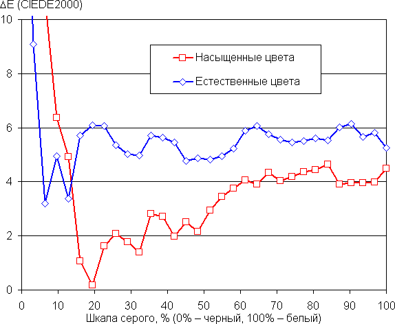 Баланс оттенков на шкале серого приемлемый. Цветовая температура после выбора профиля Естественные цвета близка к 6500 К, при этом на значимом участке шкалы серого этот параметр изменяется не очень сильно, что улучшает визуальное восприятие баланса цветов. Отклонение от спектра абсолютно черного тела (ΔE) остается ниже 10 единиц, что для потребительского устройства считается хорошим показателем, и также изменяется несильно: