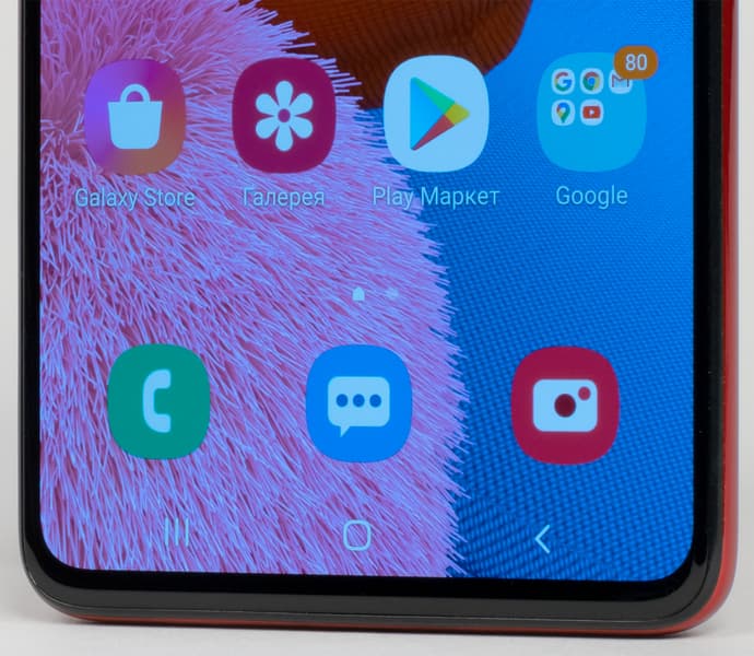 Для фронтальной камеры в экране сделан небольшой круглый вырез. Любопытно, в некоторых соседних по семейству моделях, например, А41, камера вделана в каплевидный вырез, а здесь это отверстие, но тоже посередине, а не сбоку. Камера одиночная. Почему-то, светодиодного индикатора в смартфоне не установили, а жаль.
