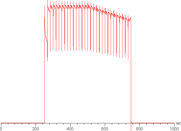 Переключение состояния элементов матрицы выполняется практически мгновенно, но на фронте включения может присутствовать ступенька шириной примерно 17 мс (что соответствует частоте обновления экрана в 60 Гц). Например, так выглядит зависимость яркости от времени при переходе от черного к белому и обратно: