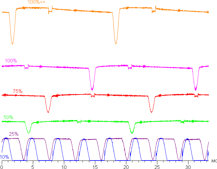 На любом уровне яркости присутствует значимая модуляция с частотой примерно 60 или 240 Гц. На рисунке ниже приведены зависимости яркости (вертикальная ось) от времени (горизонтальная ось) для нескольких значений настройки яркости: