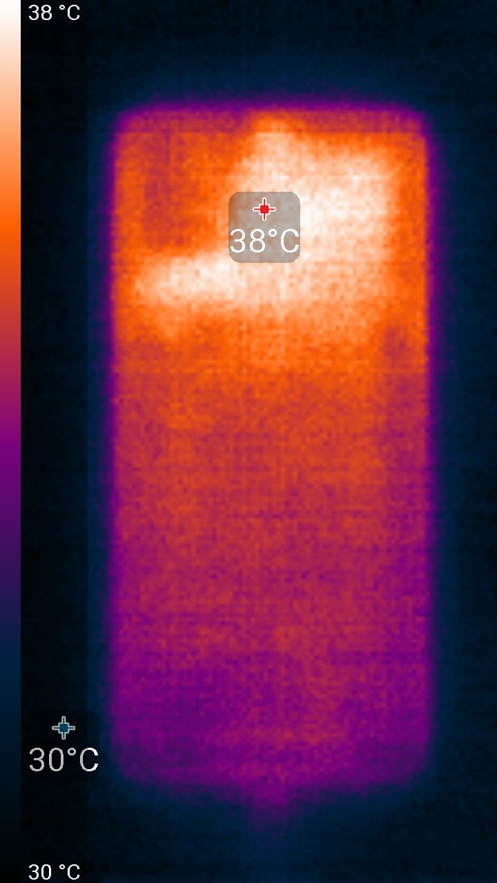 Нагрев выше в верхней части аппарата, что, видимо, соответствует расположению микросхемы SoC. По данным теплокамеры, максимальный нагрев составил 38 градусов (при температуре окружающего воздуха в 24 градуса), это не очень много.