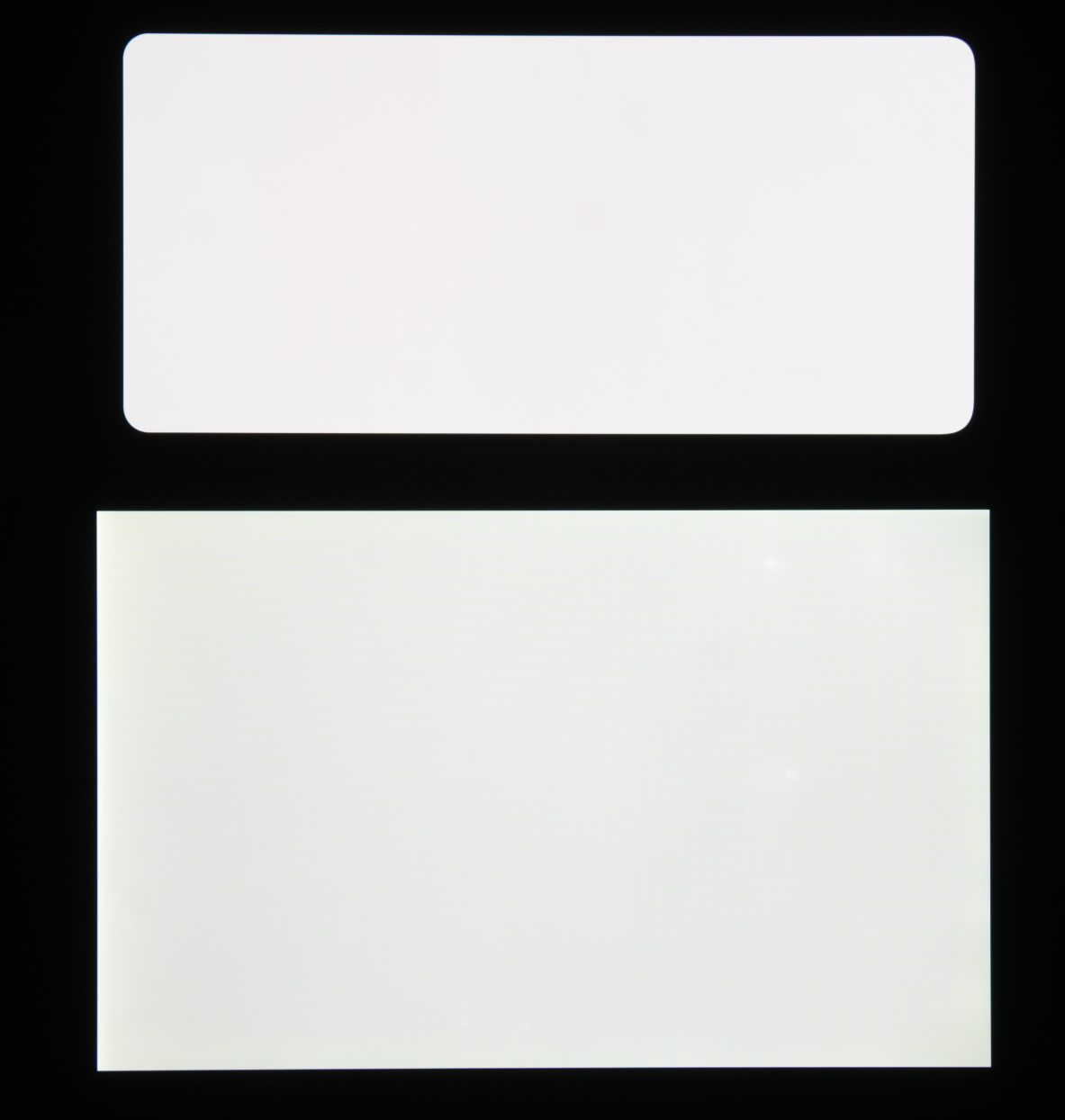 Экран характеризуется великолепными углами обзора. Правда, белый цвет при отклонении даже на небольшие углы приобретает легкий розовый или сине-зеленый оттенок, но черный цвет остается просто черным под любыми углами. Он настолько черный, что параметр контрастности в данном случае неприменим. Для сравнения приведем фотографии, на которых на экраны Samsung Galaxy A51 и второго участника сравнения выведены одинаковые изображения, при этом яркость экранов по белому полю изначально установлена примерно на 200 кд/м², а цветовой баланс на фотоаппарате принудительно переключен на 6500 К.