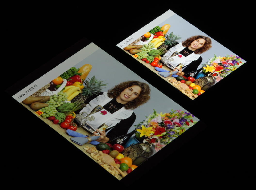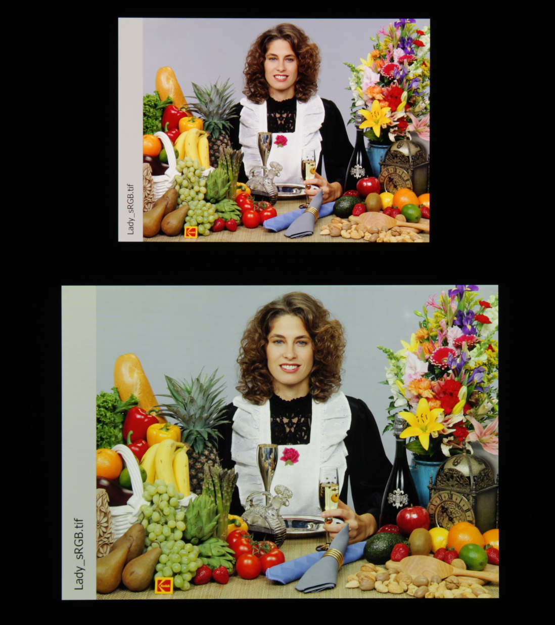 Отметим, что на экранах с широким цветовым охватом (без соответствующей коррекции) цвета́ обычных изображений, оптимизированных для устройств sRGB, выглядят неестественно насыщенными. Отсюда и рекомендация: в большинстве случаев смотреть кино, фотографии и все естественное лучше при выборе профиля Естественные цвета. И только если фотография или видеоматериал сделаны с охватом DCI, принятым в цифровом кинематографе, или Adobe RGB, то имеет смысл переключить профиль на Насыщенные цвета.