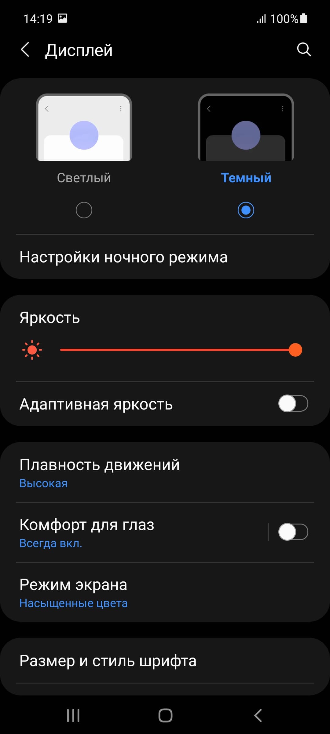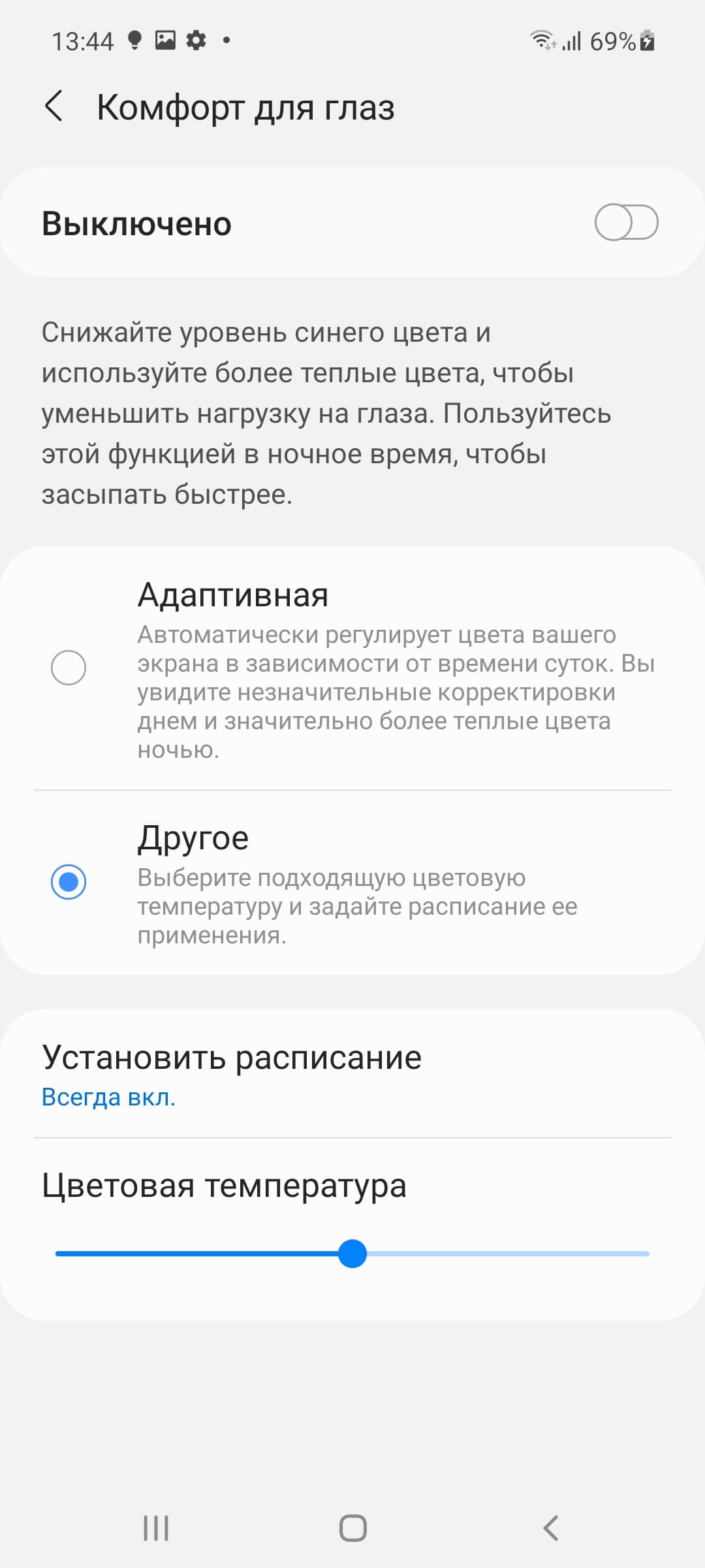 Также есть модная функция Комфорт для глаз, снижающая интенсивность синей компоненты. Почему такая коррекция может быть полезной, рассказано в статье про iPad Pro 9,7″. В любом случае, при развлечении с планшетом или смартфоном на ночь глядя лучше просто снизить яркость экрана до комфортного уровня. Желтить экран этой настройкой нет никакого смысла.