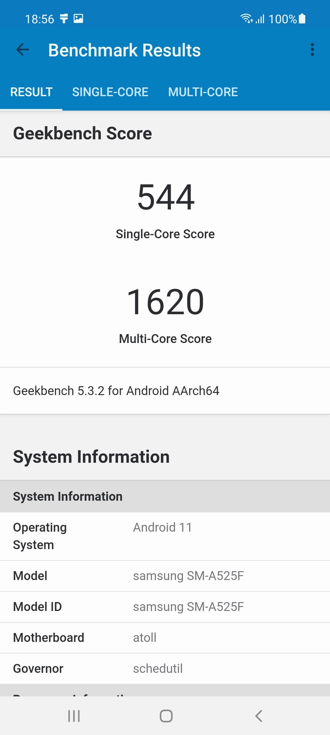 Смартфон Samsung Galaxy A52 работает на однокристальной системе Qualcomm Snapdragon 720G с 8 процессорными ядрами (2×Kryo 465 Gold @2,3 ГГц+ 6×Kryo 465 Silver @1,8 ГГц). Графический процессор — Adreno 618.