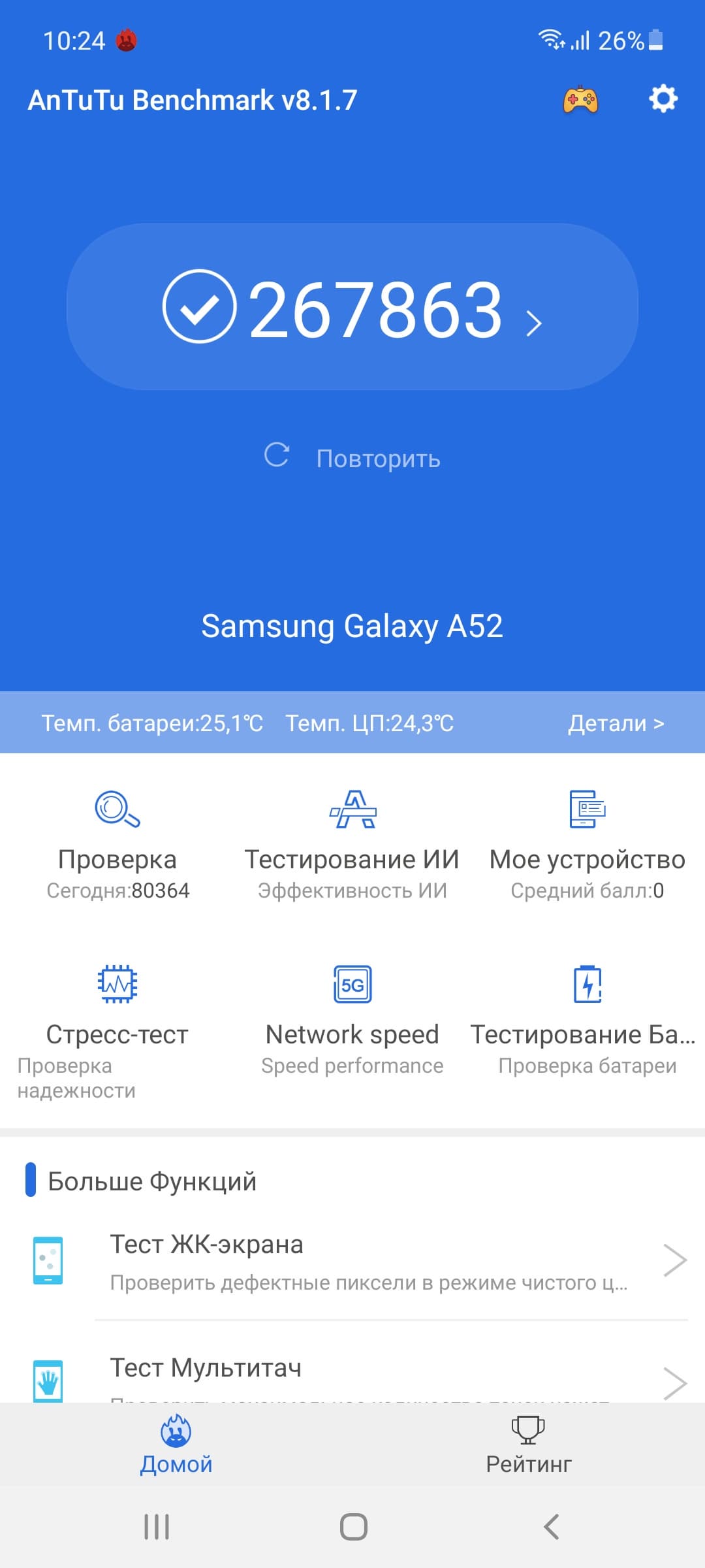 Samsung Galaxy A52 имеет встроенную батарею с типичной для современных смартфонов емкостью. Автономность у него очень высокая — правда, протестировать смартфоны Samsung в игровом режиме с недавних пор не представляется возможным, поскольку игровой процесс прерывается при бездействии более нескольких минут. В реальной эксплуатации смартфон ведет себя так же, как большинство современных смартфонов: без ночной зарядки ему не обойтись.