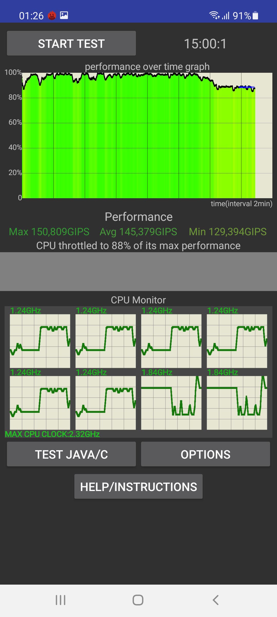 Тестирование традиционно проводилось на обычном уровне энергопотребления без использования функций энергосбережения, хотя таковые в аппарате имеются. Условия тестирования: выставлен минимальный комфортный уровень яркости (примерно 100 кд/м²). Тесты: беспрерывное чтение в программе Moon+ Reader (со стандартной, светлой темой); беспрерывный просмотр видео в HD-качестве (720р) через домашнюю сеть Wi-Fi; игра Injustice 2 с автонастройками графики.