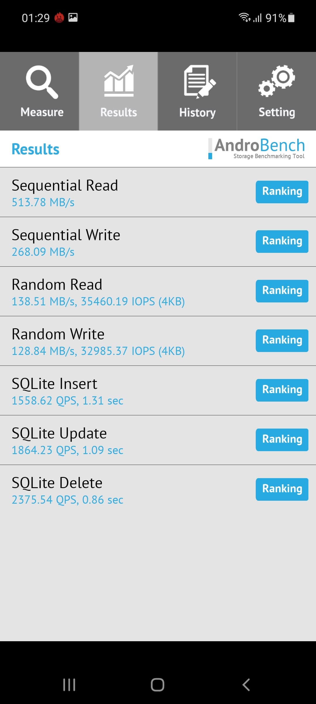 Объем оперативной памяти составляет 4 ГБ, объем хранилища — 128 ГБ (из них доступно около 102 ГБ). Можно устанавливать в смартфон карту памяти, поддерживается подключение внешних устройств к порту USB Type-C в режиме USB OTG. Позже в продаже появилась версия смартфона с объемом памяти 8/256 ГБ.