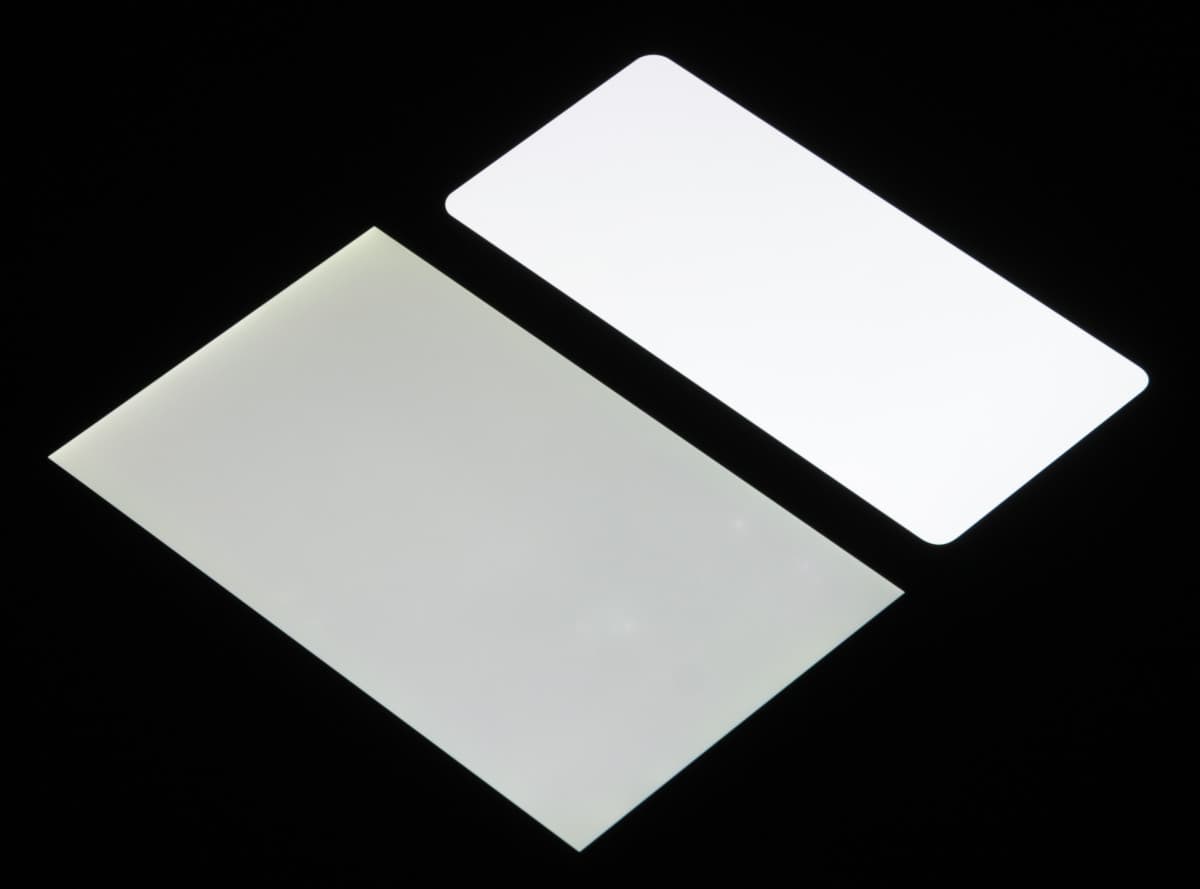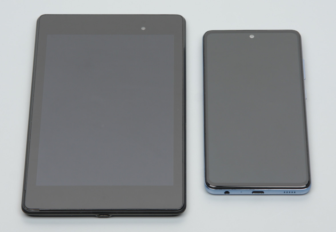 Лицевая поверхность экрана выполнена в виде стеклянной пластины с зеркально-гладкой поверхностью, устойчивой к появлению царапин. Судя по отражению объектов, антибликовые свойства экрана не хуже, чем у экрана Google Nexus 7 (2013) (далее просто Nexus 7). Для наглядности приведем фотографию, на которой в выключенных экранах отражается белая поверхность (слева — Nexus 7, справа — Samsung Galaxy A52, далее их можно различать по размеру):