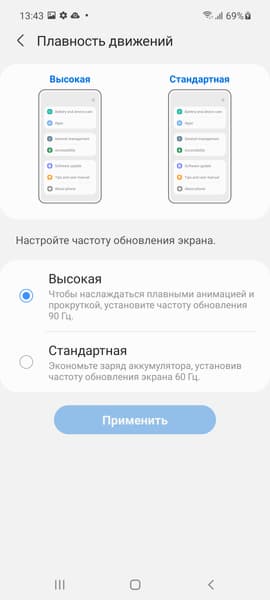 В режиме 90 Гц плавность прокрутки списков меню заметно повышается.