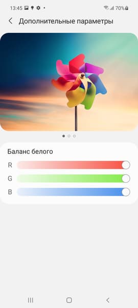 Почему-то только при выборе профиля Насыщенные цвета появляется возможность настройки цветового баланса регулировкой цветовой температуры и тремя регулировками интенсивности основных цветов, но из-за слишком широкого цветового охвата как раз в этом профиле нет смысла исправлять именно баланс.
