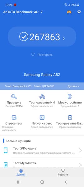 | AnTuTu (v8.x) (больше — лучше) | 267863 | 277886 | 292082 | 339871 | 219440 |