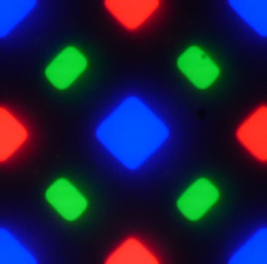 В этом экране используется матрица Super AMOLED — активная матрица на органических светодиодах. Полноцветное изображение создается с помощью субпикселей трех цветов — красного (R), зеленого (G) и синего (B), но красных и синих субпикселей в два раза меньше, что можно обозначить как RGBG. Это подтверждается фрагментом микрофотографии: