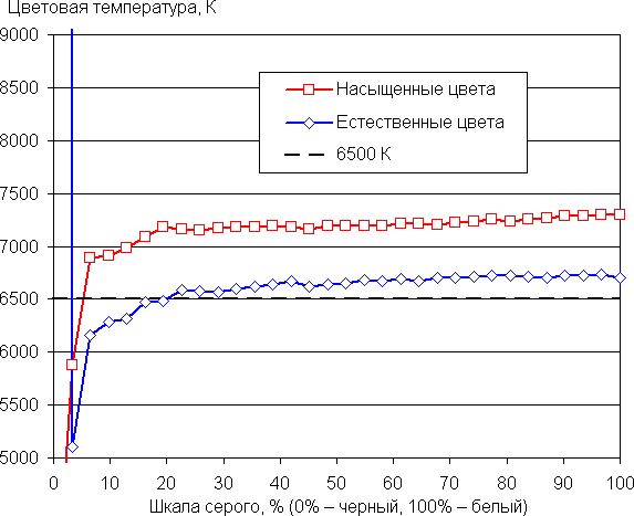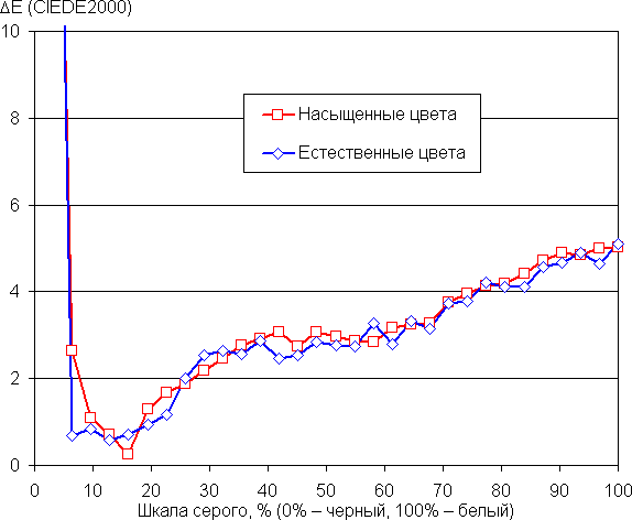 Баланс оттенков на шкале серого приемлемый. Цветовая температура после выбора профиля Естественные цвета близка к 6500 К, при этом на значимом участке шкалы серого этот параметр изменяется не очень сильно, что улучшает визуальное восприятие баланса цветов. Отклонение от спектра абсолютно черного тела (ΔE) остается ниже 10 единиц, что для потребительского устройства считается хорошим показателем, и также изменяется несильно: