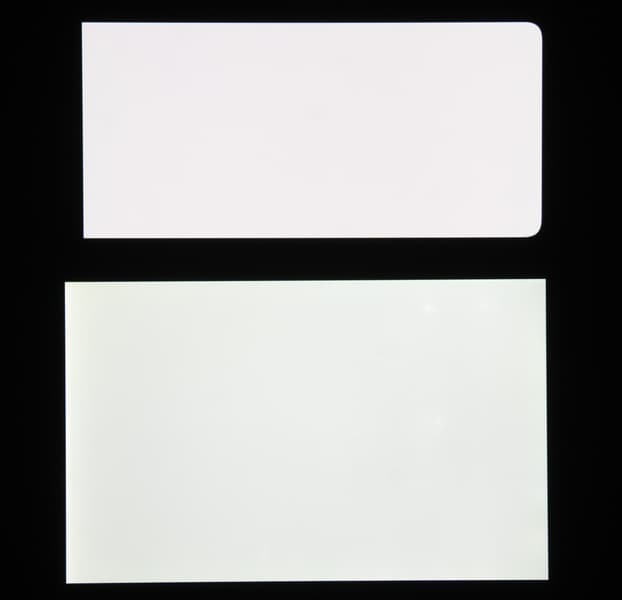 Экран характеризуется великолепными углами обзора. Правда, белый цвет при отклонении даже на небольшие углы приобретает легкий сине-зеленый или розоватый оттенок, но черный цвет остается просто черным под любыми углами. Он настолько черный, что параметр контрастности в данном случае неприменим. Для сравнения приведем фотографии, на которых на экраны Samsung Galaxy A52 и второго участника сравнения выведены одинаковые изображения, при этом яркость экранов по белому полю изначально установлена примерно на 200 кд/м², а цветовой баланс на фотоаппарате принудительно переключен на 6500 К.
