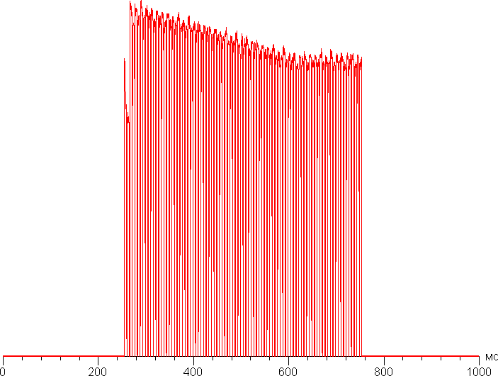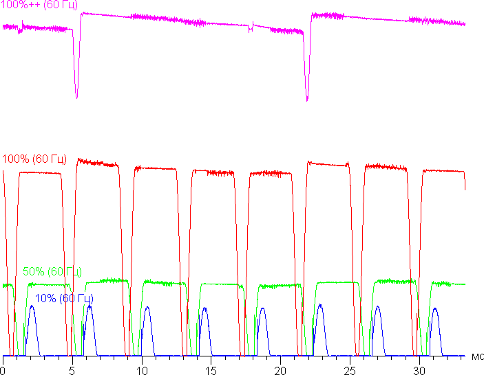 На любом уровне яркости присутствует значимая модуляция с частотой примерно 60, 90, 180 или 240 Гц. На рисунках ниже приведены зависимости яркости (вертикальная ось) от времени (горизонтальная ось) для нескольких значений настройки яркости: