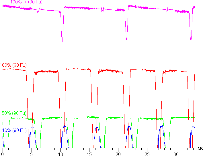 Видно, что на максимальной (как «100%++» мы обозначили режим с дополнительной засветкой датчика освещенности ярким светом) яркости амплитуда модуляции не очень большая, в итоге видимого мерцания нет. На средней яркости амплитуда модуляции большая, но скважность низкая, поэтому видимого мерцания также нет. Однако при сильном понижении яркости появляется модуляция с большой относительной амплитудой и высокой скважностью, ее наличие уже можно увидеть в тесте на присутствие стробоскопического эффекта или просто при быстром движении глаз. В зависимости от индивидуальной чувствительности такое мерцание может вызывать повышенную утомляемость. Впрочем, фаза модуляции различается по зонам, поэтому негативный эффект от мерцания снижен.