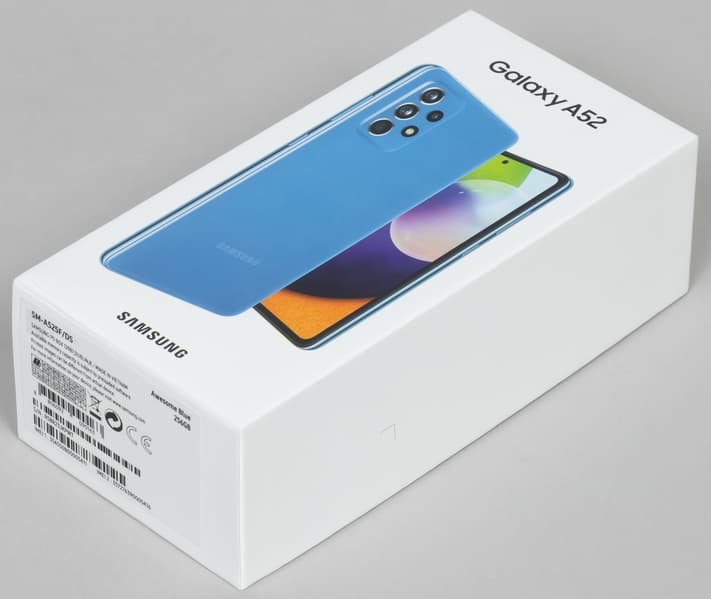 Samsung Galaxy A52 поставляется в стандартно оформленной картонной коробке без особых дизайнерских изысков.