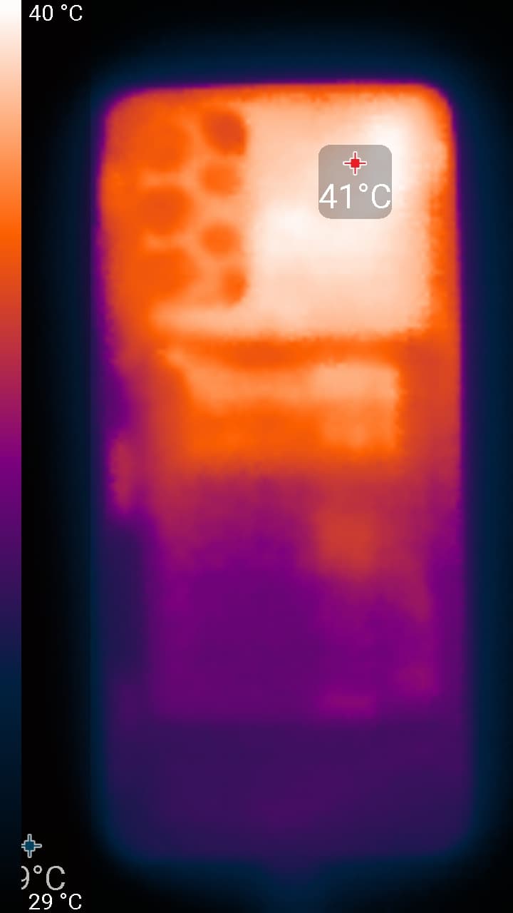 Нагрев выше в верхней части аппарата, что, видимо, соответствует расположению микросхемы SoC. По данным теплокамеры, максимальный нагрев составил 41 градус (при температуре окружающего воздуха в 24 градуса), это средний нагрев в данном тесте для современных смартфонов.