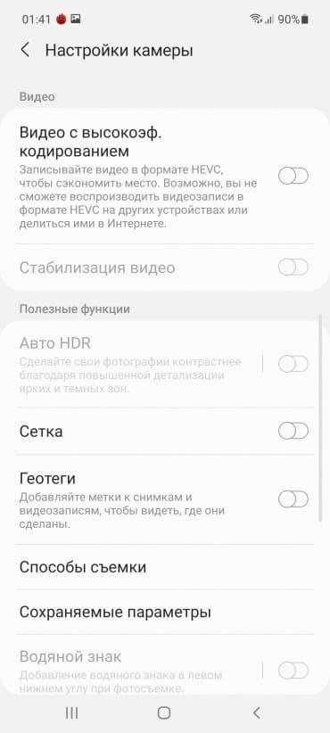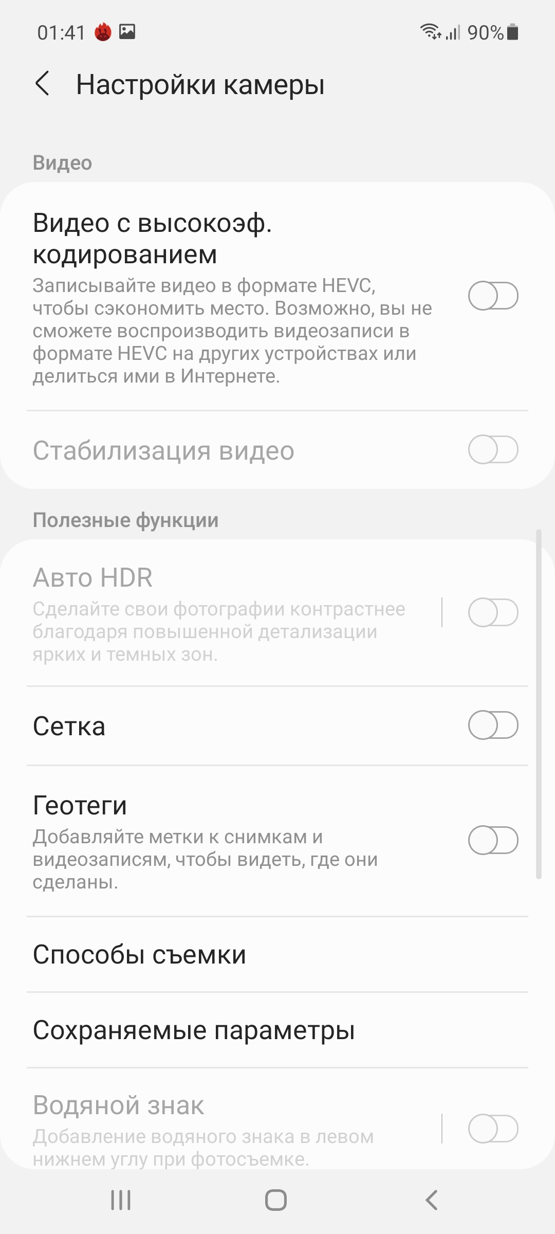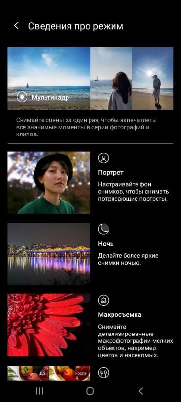 Интерфейс управления съемкой стандартный: есть Auto HDR, портретный, ночной режимы, фирменный мультикадр, отключаемая стабилизация, возможность съемки с функцией объединения 4 пикселей в один. Нет только возможности сохранять снимки в RAW.