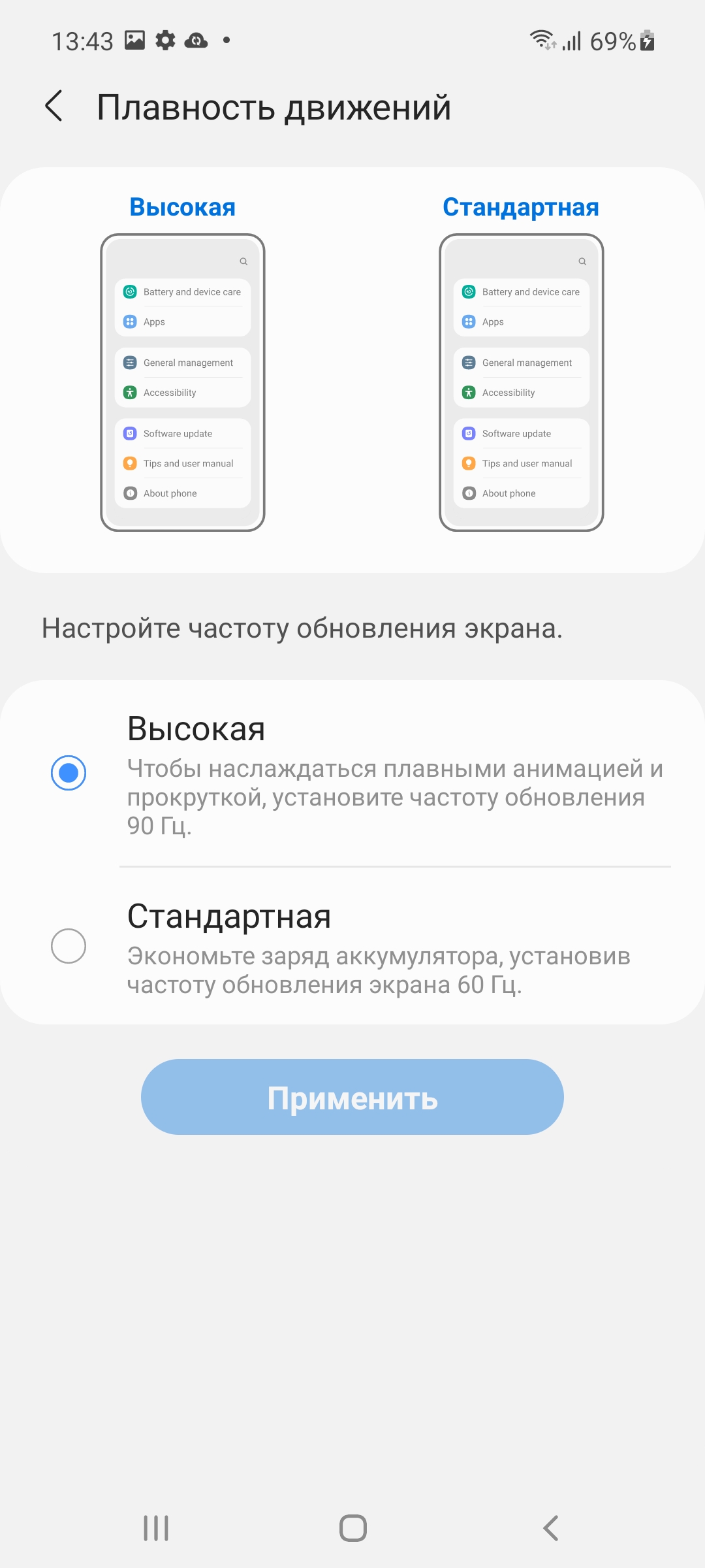 В настройках экрана можно включить режим с повышенной до 90 Гц частотой обновления: