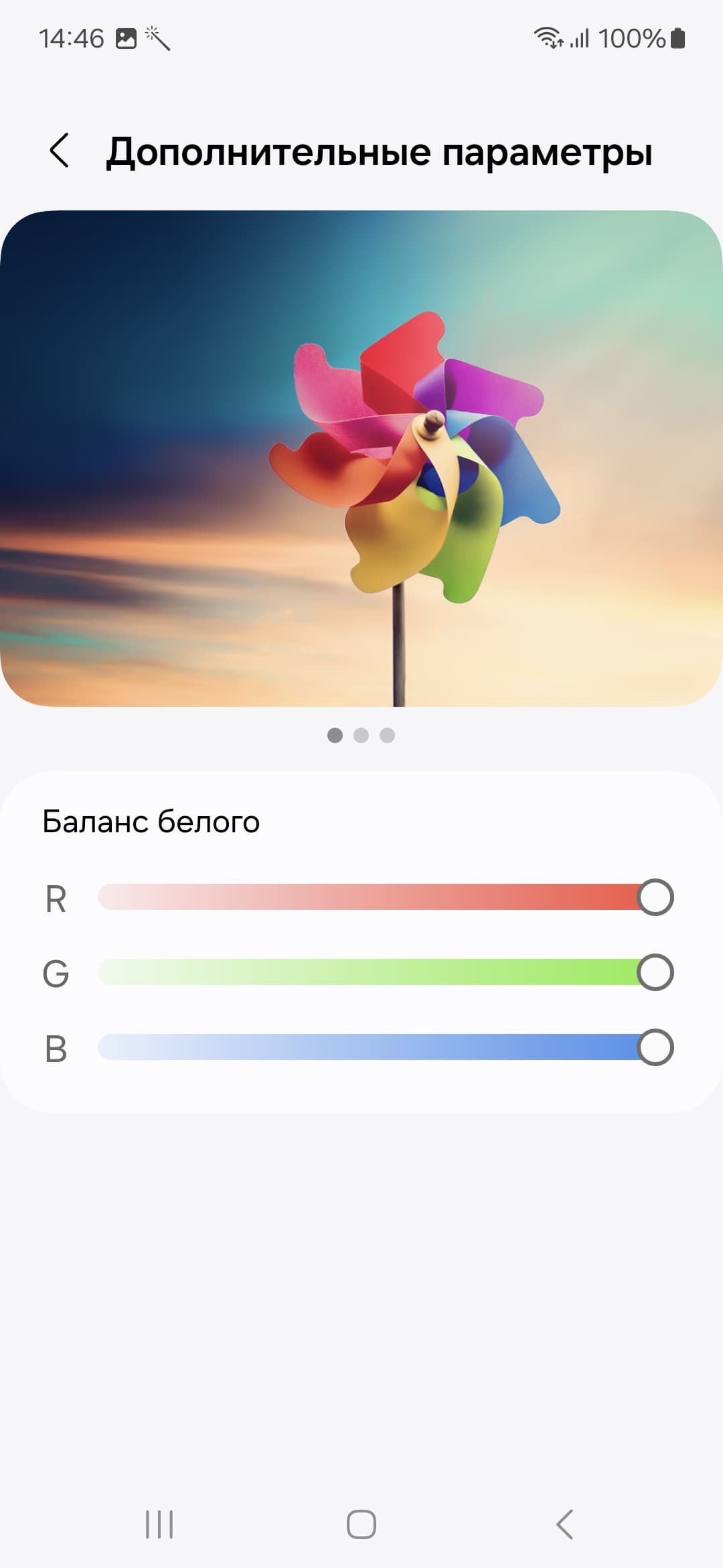 Почему-то только при выборе профиля Насыщенные цвета появляется возможность настройки цветового баланса регулировкой цветовой температуры и тремя регулировками интенсивности основных цветов, но из-за слишком широкого цветового охвата как раз в этом профиле нет смысла исправлять именно баланс.