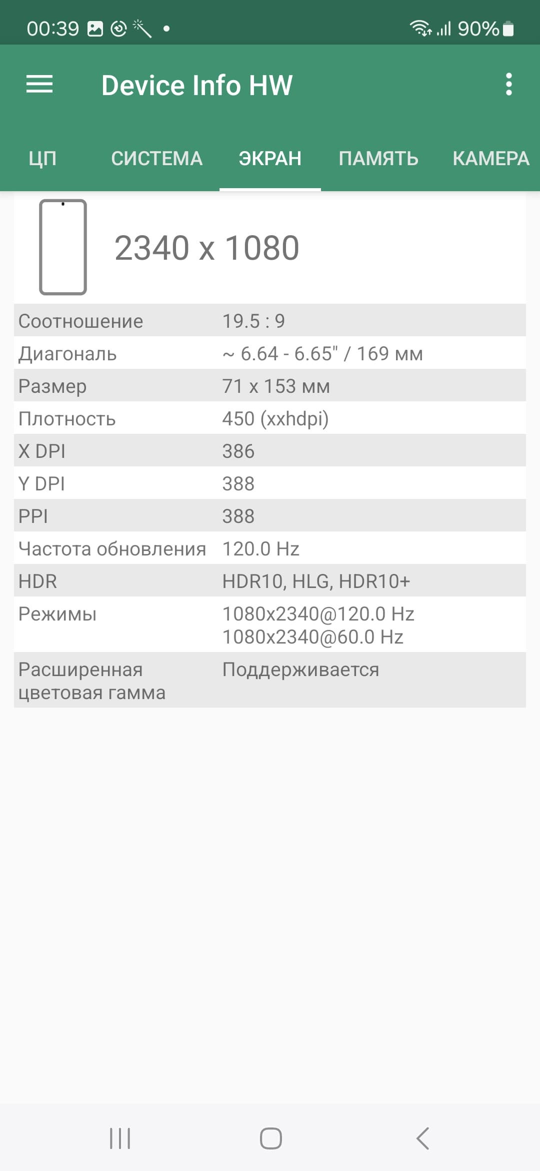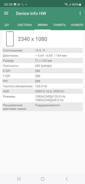 - Сенсорный дисплей AMOLED, 6,6″, 2340×1080, 20:9, 390 ppi, 120 Гц