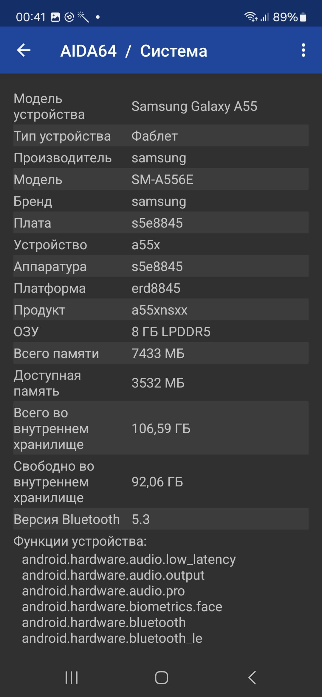 Смартфон Samsung Galaxy A55 5G поддерживает большинство диапазонов мобильных сетей вплоть до 5G, два диапазона Wi-Fi 6 и Bluetooth 5.3, есть поддержка NFC. Что касается поддержки e-SIM, то она может быть или не быть в зависимости от модификации. В версии SM-A556E поддержка e-SIM есть. На практике в пределах городской черты московского региона аппарат демонстрирует уверенную работу в беспроводных сетях, не теряет связь, быстро восстанавливает связь после вынужденного обрыва. Все необходимые встроенные датчики, вплоть до гироскопа, на месте.