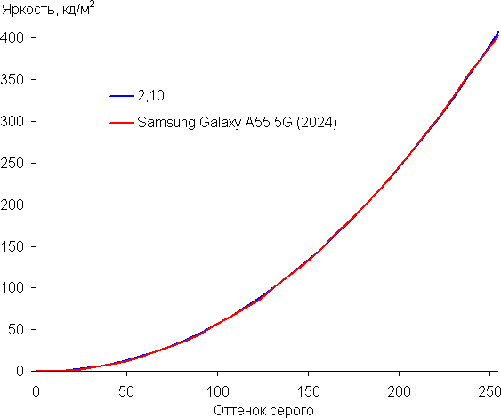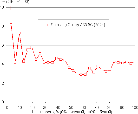 Напомним, что в случае OLED-экранов яркость фрагментов изображения динамично меняется в соответствии с характером выводимого изображения — чуть уменьшается для светлых в целом изображений. В итоге полученная зависимость яркости от оттенка (гамма-кривая), скорее всего, не соответствует гамма-кривой статичного изображения, так как измерения проводились при последовательном выводе оттенков серого почти на весь экран.
