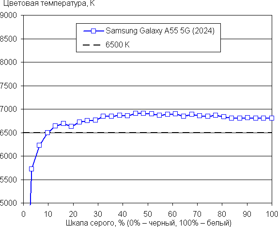 Баланс оттенков на шкале серого хороший. Цветовая температура, особенно после выбора профиля Естественные цвета близка к 6500 К, при этом на значимом участке шкалы серого этот параметр изменяется не очень сильно, что улучшает визуальное восприятие баланса цветов. Отклонение от спектра абсолютно черного тела (ΔE) на большей части шкалы серого остается ниже 10 единиц, что для потребительского устройства считается приемлемым показателем, и разброс этой характеристики также не очень большой: