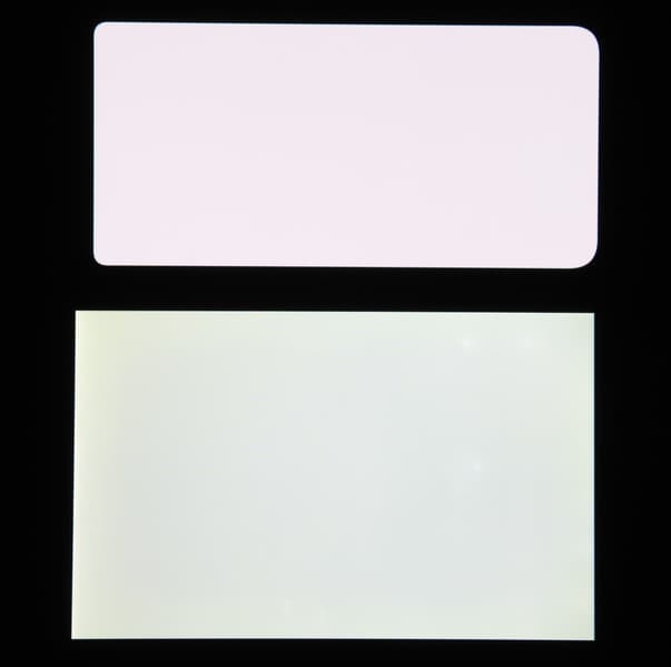 Экран характеризуется великолепными углами обзора. Яркость под углом у обоих экранов заметно уменьшается (если сравнивать с Nexus 7), но в случае смартфона падение яркости выражено гораздо меньше. В итоге при формально одинаковой яркости экран этого смартфона визуально выглядит гораздо более ярким (в сравнении с ЖК-экранами), так как на экран мобильного устройства часто приходится смотреть как минимум под небольшим углом. Правда, у смартфона к белому цвету при отклонении на большие углы едва заметно попеременно примешиваются оттенки радуги, но черный цвет остается просто черным под любыми углами. Он настолько черный, что параметр контрастности в данном случае неприменим. Для сравнения приведем фотографии, на которых на экраны смартфона и второго участника сравнения выведены одинаковые изображения, при этом яркость экранов изначально установлена примерно на 200 кд/м², а цветовой баланс на фотоаппарате принудительно переключен на 6500 К.