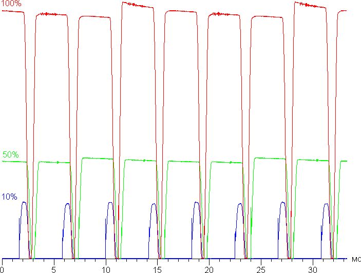 Видно, что на высокой и средней яркости амплитуда модуляции большая, но скважность низкая, в итоге видимого мерцания нет. Однако при сильном понижении яркости появляется модуляция с большой относительной амплитудой и высокой скважностью, ее наличие уже можно увидеть в тесте на присутствие стробоскопического эффекта или просто при быстром движении глаз. В зависимости от индивидуальной чувствительности такое мерцание может вызывать повышенную утомляемость. Впрочем, фаза модуляции различается по площади экрана, поэтому негативный эффект от мерцания снижен.