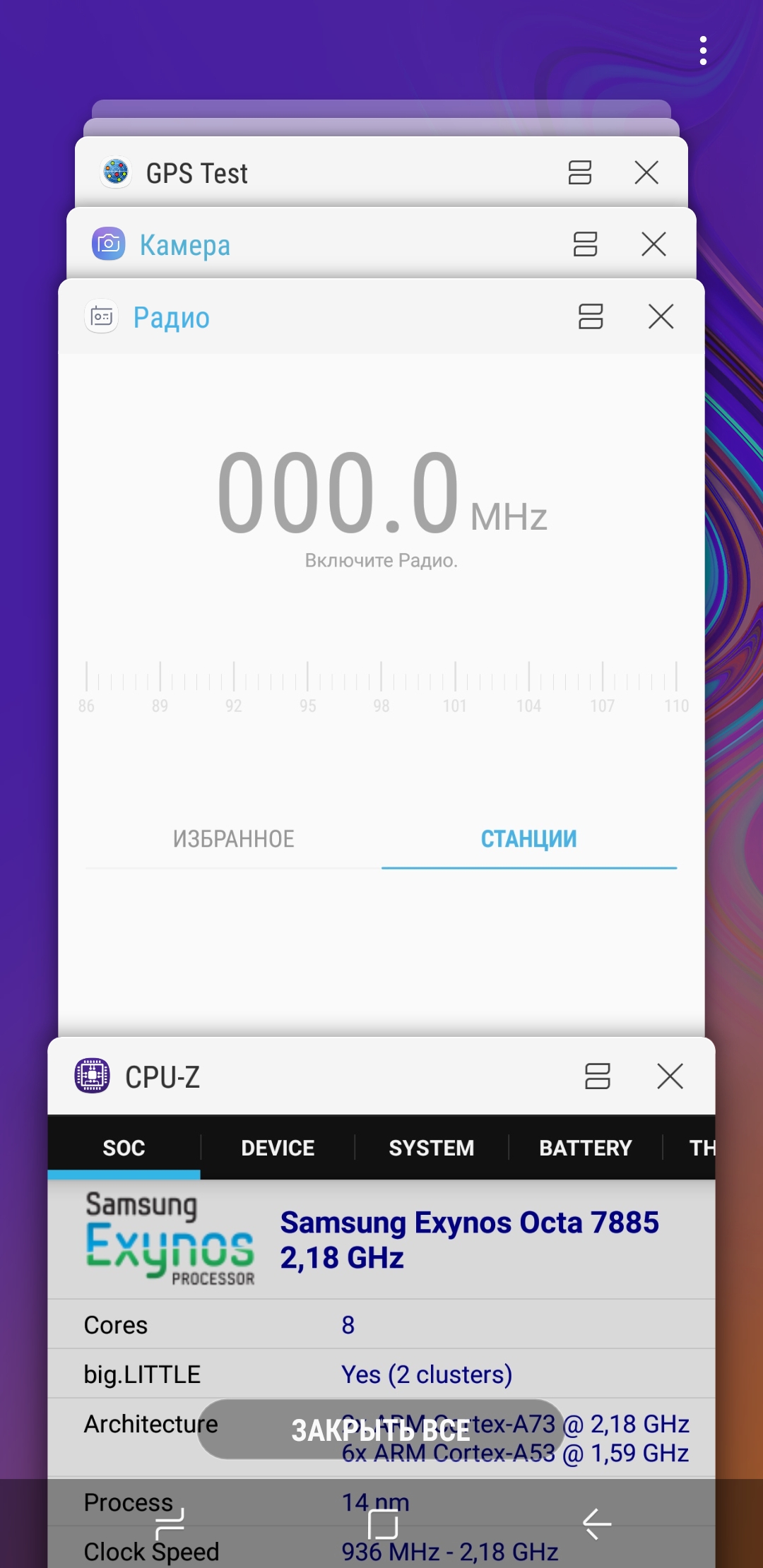 - SoC Samsung Exynos 7885, 2 ядра ARM Cortex-A73 @2,2 ГГц + 6 ядер ARM Cortex-A53 @1,6 ГГц