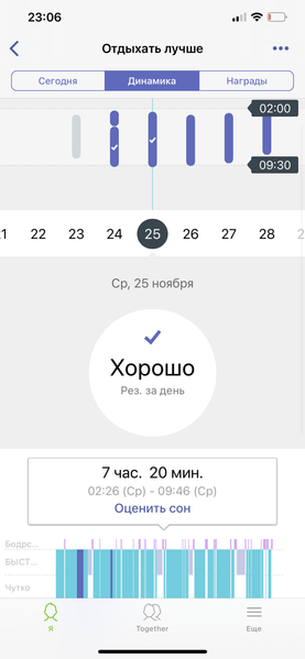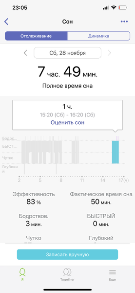 Еще из плюсов: браслет весьма точно фиксирует сон. Причем, что ценно, умеет определять и дневной сон, а также моменты утреннего досыпания (когда вы, например, встали на пять минут, а потом опять легли и заснули). На скриншоте ниже слева показан как раз дневной сон.