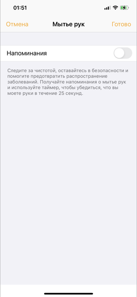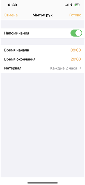 Еще одна настройка в приложении, на которую хочется обратить внимание — «Мытье рук». Работает она, впрочем, специфически: вы можете настроить напоминания о мытье рук: например, каждые два часа в диапазоне с 8 утра до 8 вечера (такой вариант предлагается по умолчанию).