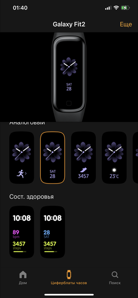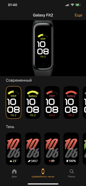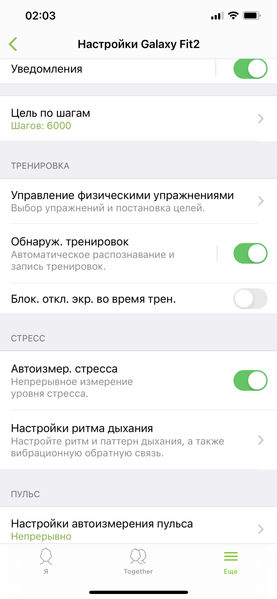 Сопряжение со смартфоном (мы использовали iPhone 12 Pro Max) проходит без проблем. Однако, целесообразность такого разделения на два приложения представляется сомнительной: фактически, первое из них — Samsung Galaxy Fit — представляет собой лишь набор настроек, которые вряд ли будут нужны вам в повседневном использовании.