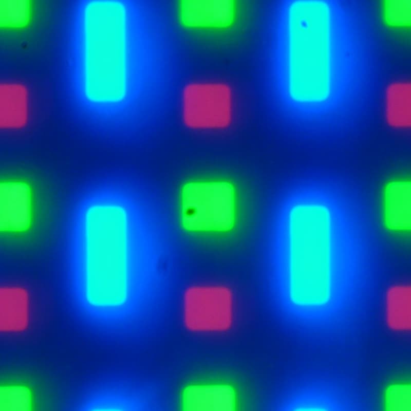 В этом экране используется матрица Super AMOLED — активная матрица на органических светодиодах. Полноцветное изображение создается с помощью субпикселей трех цветов — красного (R), зеленого (G) и синего (B) в равном количестве, что подтверждается фрагментом микрофотографии: