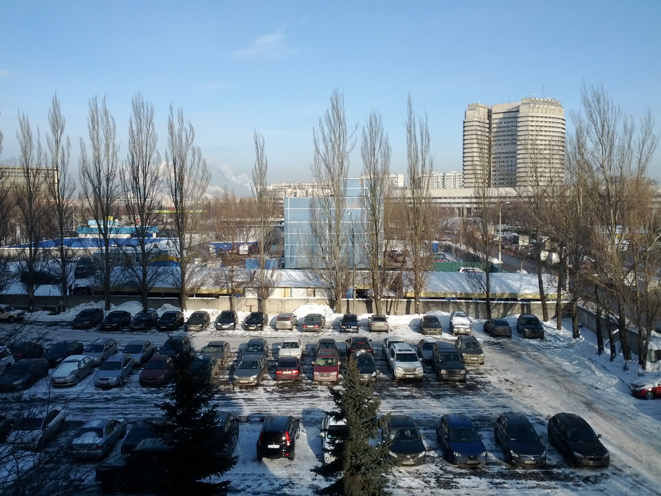 Да, если не увеличивать до 100%, то снимки выглядят достаточно естественно. Но увеличение показывает, что четкости недостает. На кадре ниже (это фрагмент снимка выше) мы не можем разобрать номера даже ближнего к нам ряда машин. Хотя съемка велась в ясный солнечный день (насколько это возможно зимой).