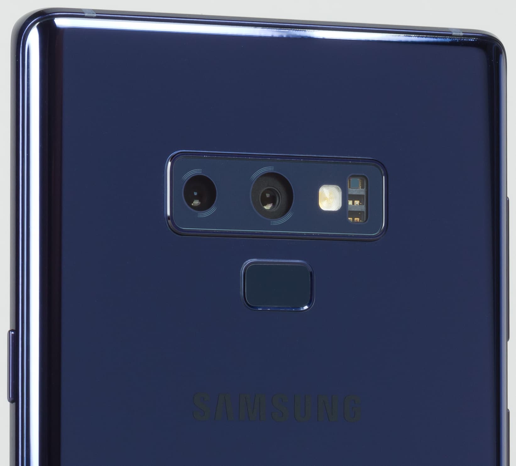 Глазки самих камер не отцентрированы относительно отверстий в корпусе, это заметили буквально все. Выглядит неряшливо, и почему-то у Samsung постоянно возникают такие вот конфузы с симметрией. Площадка сканера отпечатков пальцев чуть утоплена, она легко находится на ощупь, но расположена довольно близко к блоку камеры, поэтому палец иногда попадает на стекло, прикрывающее объективы, и потом приходится оттирать с него отпечатки.
